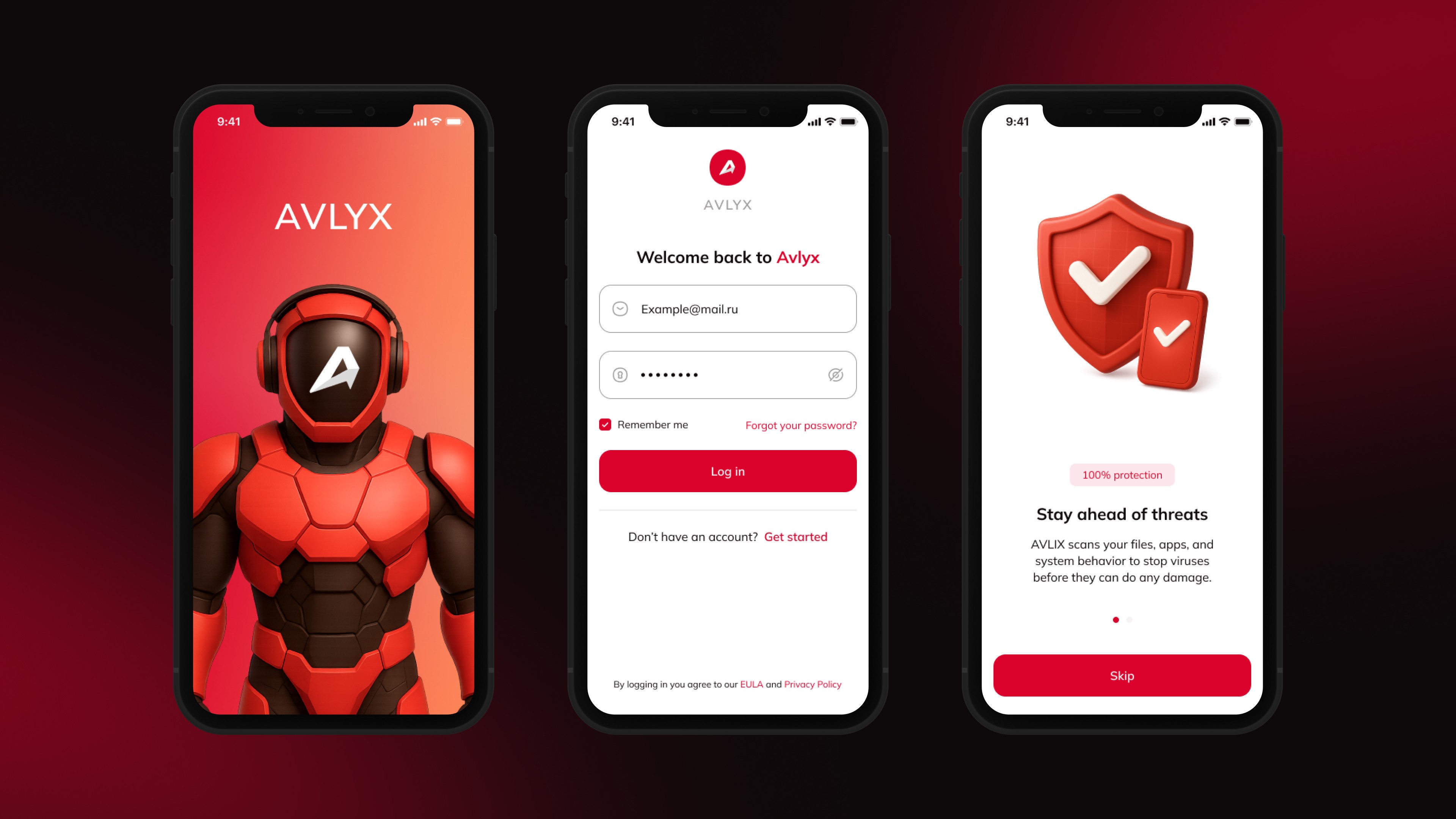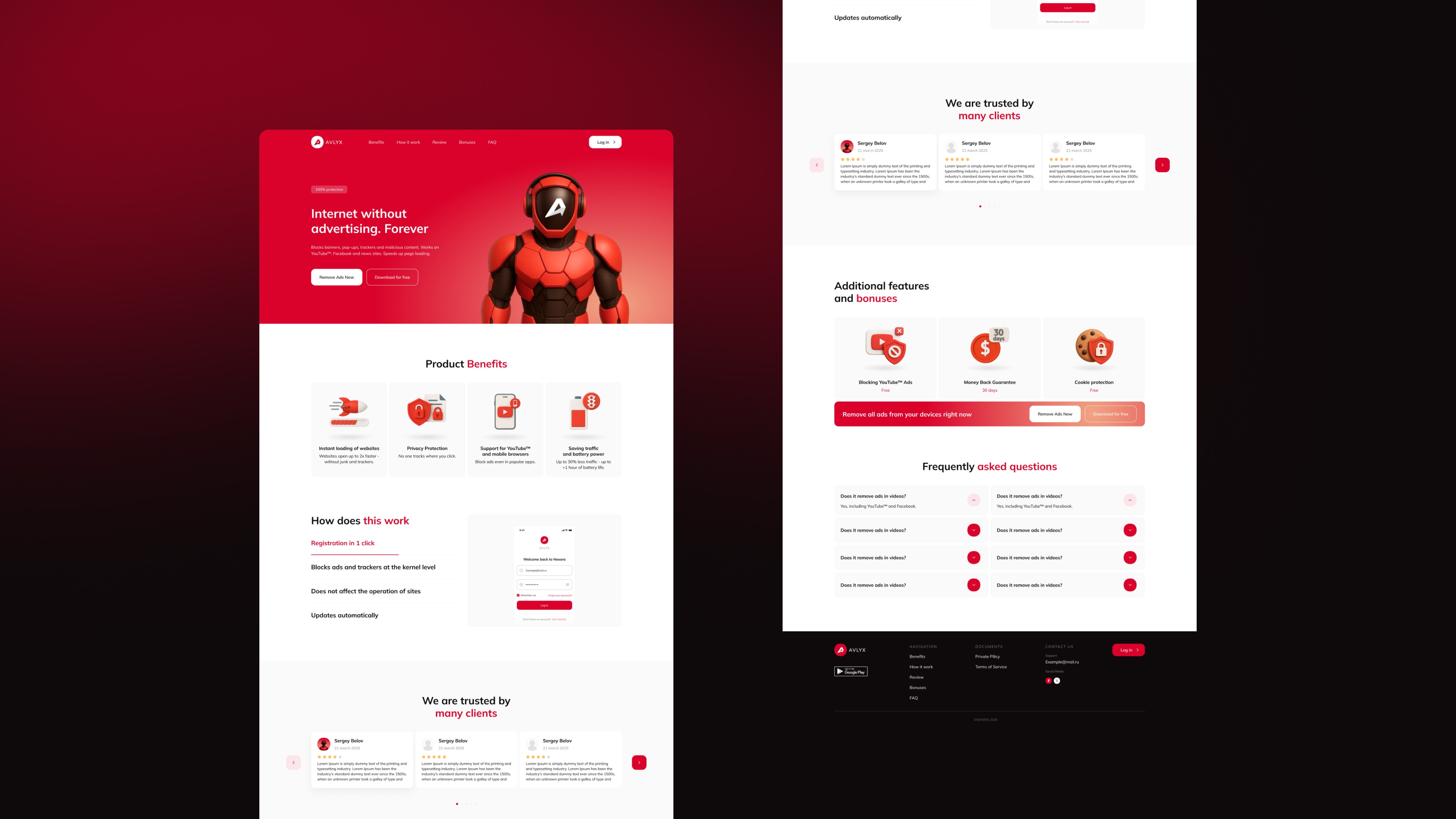 Comprehensive design for Avlyx, a mobile antivirus and ad blocker app, including branding, mobile UI, promotional landing pages, and an admin dashboard.