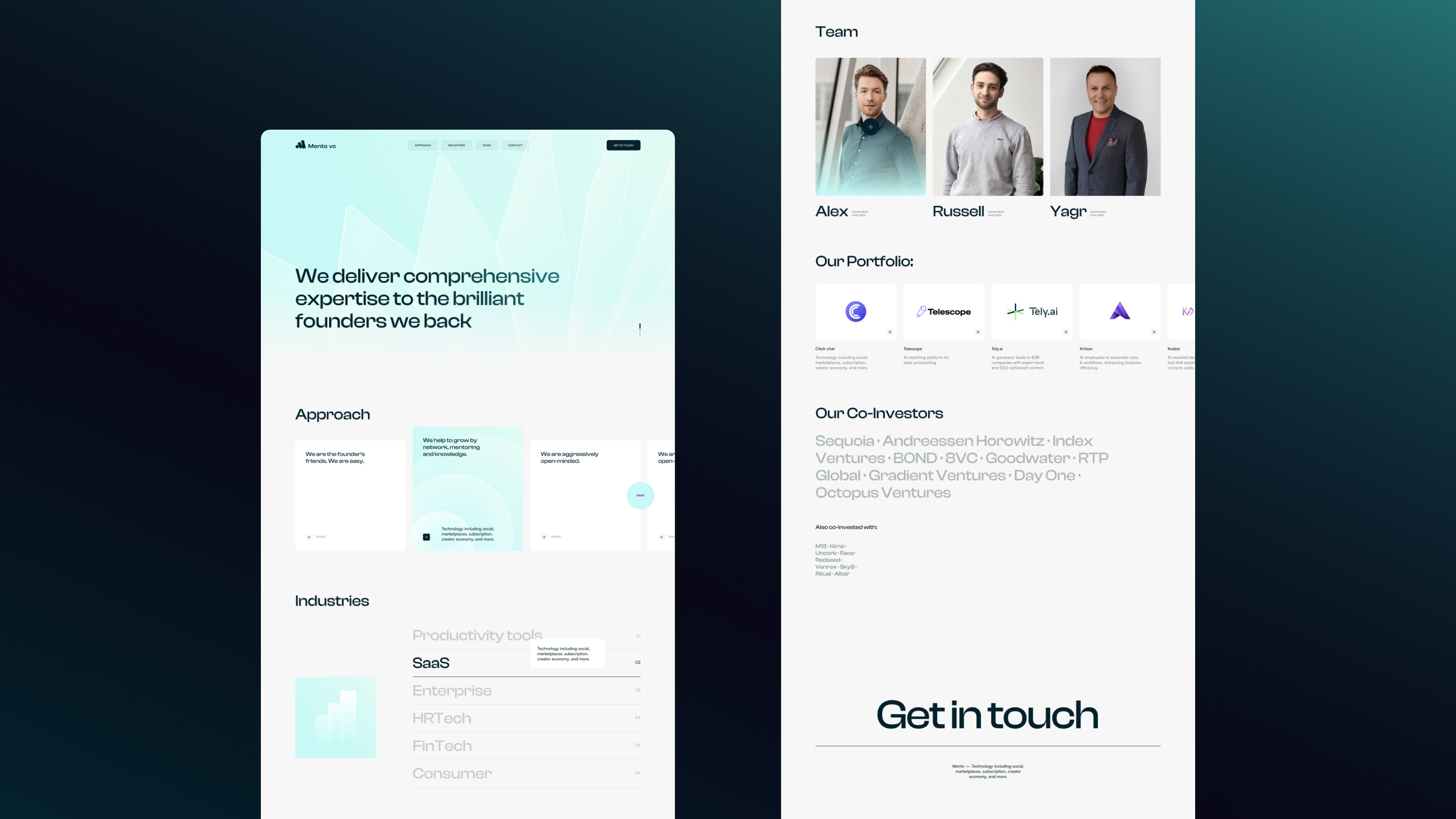 Responsive landing page designed to communicate Mento VC’s investment approach, highlight key portfolio companies, and present the founding team with clarity and trust. The design emphasizes precision, confidence, and modernity.