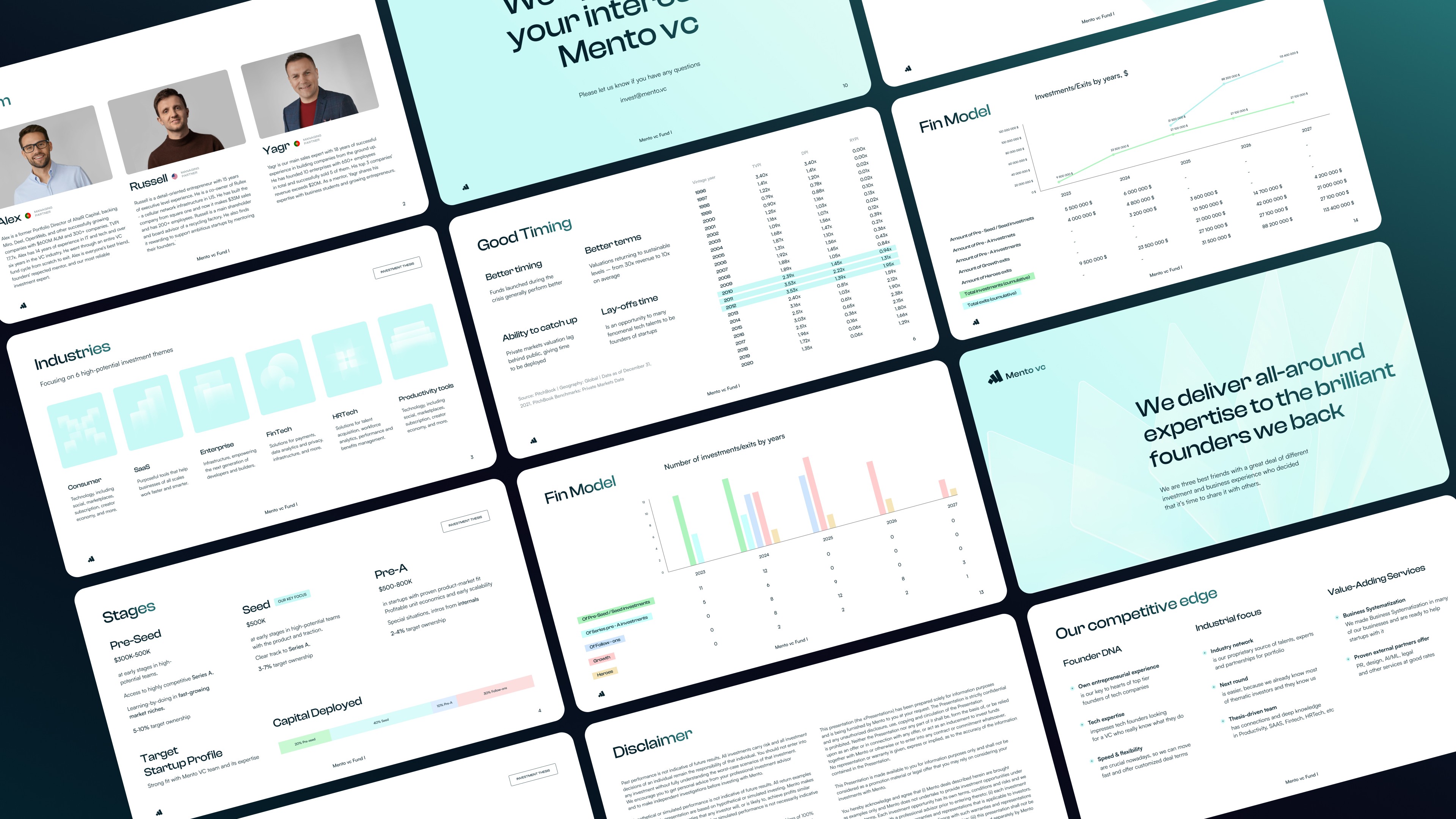 Landing and pitch deck design for Mento VC, a venture capital firm focusing on early-stage startups in productivity tools, future of work, and fintech sectors.