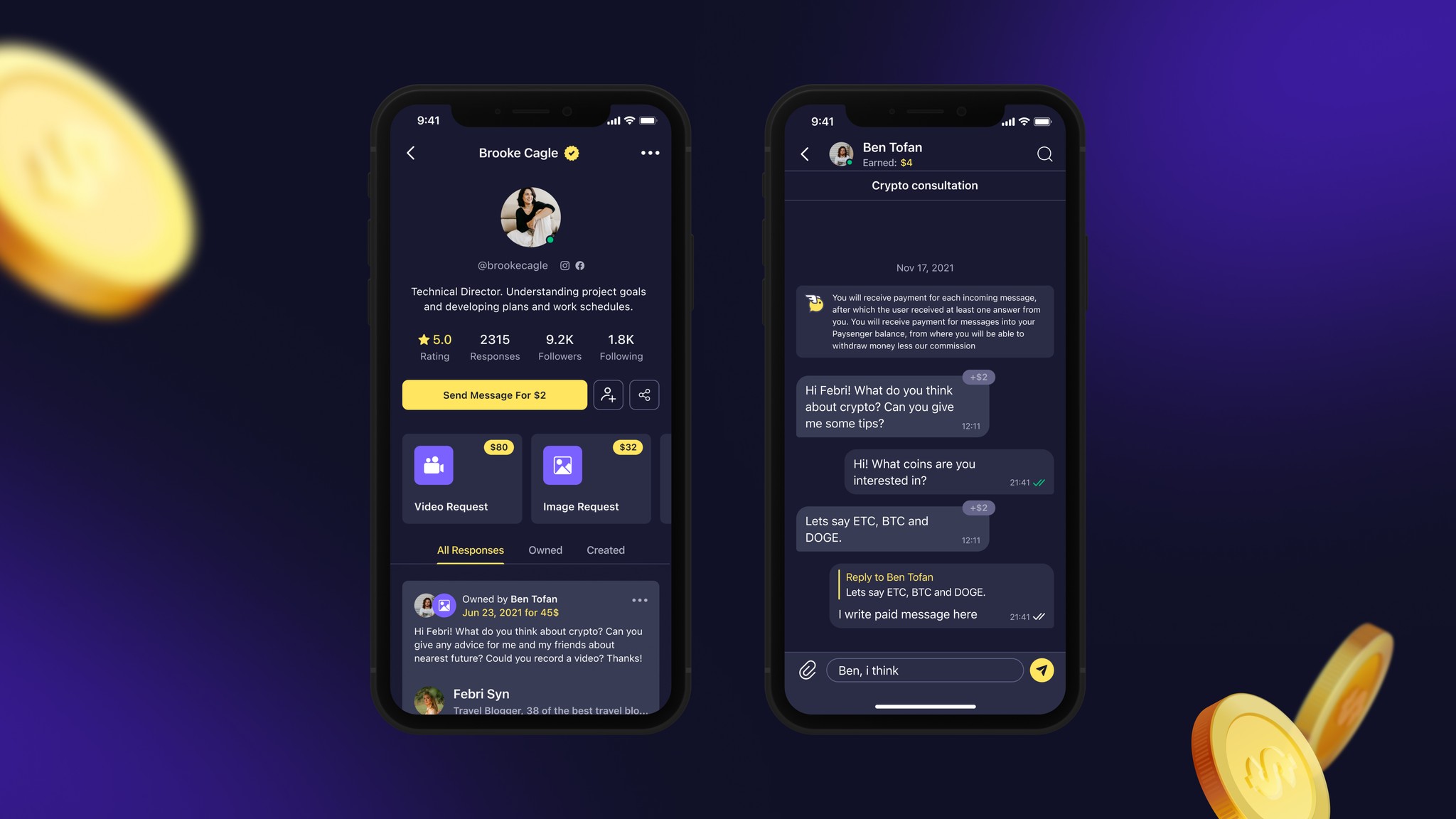 Mobile app design for a platform that helps influencers earn through direct communication with their audience.